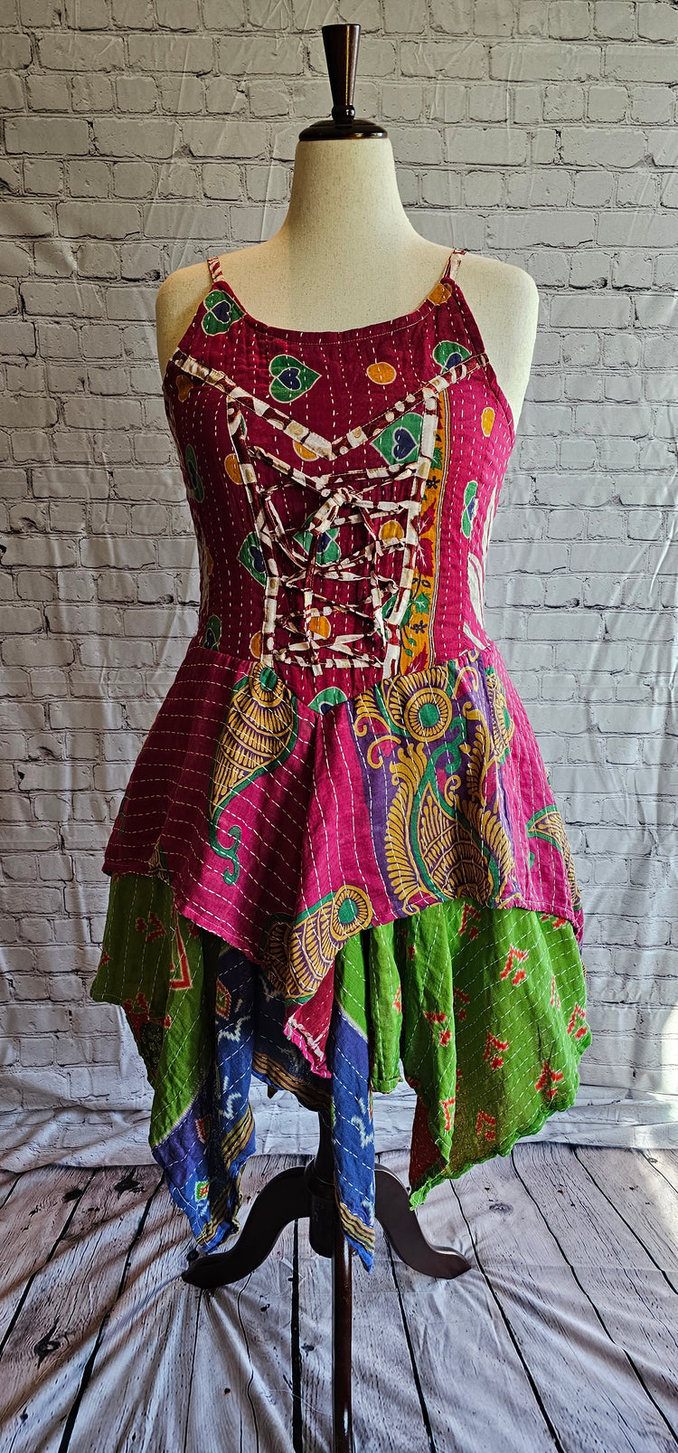 The Krysta Kantha Dress in Peacock Bloom is a vibrant, one-of-a-kind piece crafted from recycled cotton saris. Featuring traditional Kantha embroidery, a flowing boho handkerchief hem, and an adjustable free-size fit (tested on XS–2X), the Krysta moves beautifully and flatters every shape. Each dress is a unique celebration of color, texture, and sustainable craftsmanship — no two are alike.