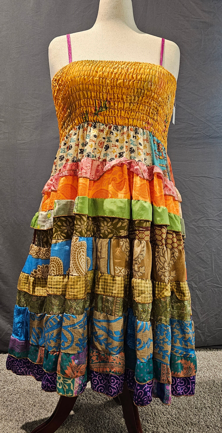 The Meadowlark Recycled Sari Dress, Golden Horizon blends effortless boho style with mindful sustainability. Crafted from reclaimed vintage saris, each piece is truly one-of-a-kind — rich with color, movement, and history. Designed with a free-size fit (S–2X), adjustable straps, and a graceful tiered silhouette, the Meadowlark drapes beautifully across every body and season — where comfort meets craftsmanship in perfect balance.