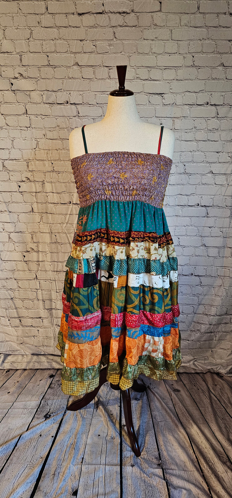 The Meadowlark Recycled Sari Dress, Forest Muse blends effortless boho style with mindful sustainability. Crafted from reclaimed vintage saris, each piece is truly one-of-a-kind — rich with color, movement, and history. Designed with a free-size fit (S–2X), adjustable straps, and a graceful tiered silhouette, the Meadowlark drapes beautifully across every body and season — where comfort meets craftsmanship in perfect balance.