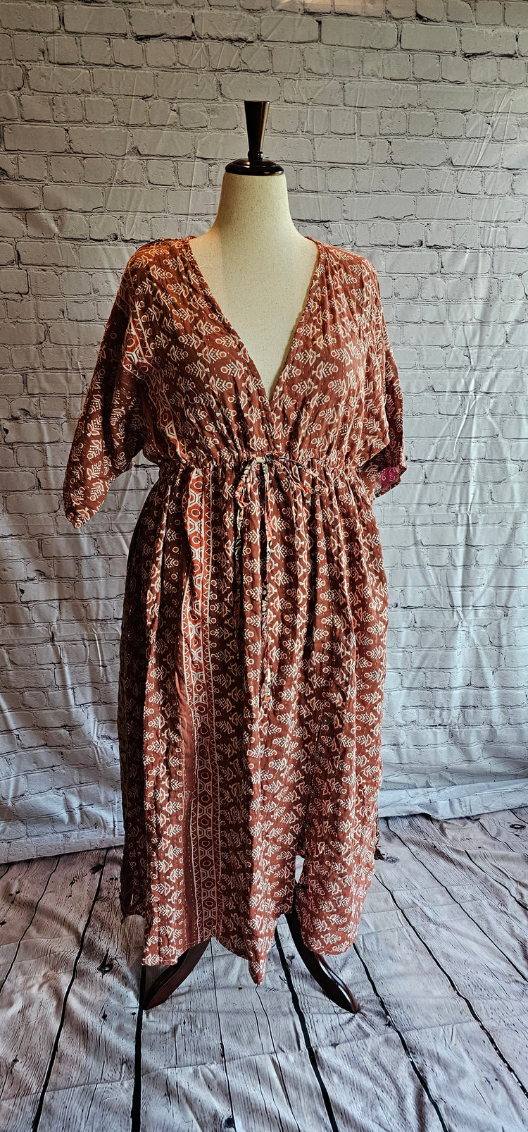 The Mosswynd Kantha Dress in Terracotta Muse is crafted from 100% recycled cotton saris with traditional Kantha embroidery, each piece is truly one-of-a-kind. Featuring a flowing silhouette, adjustable under-bust drawstring, hidden pockets, and alluring front button slit, the Mosswynd blends effortless boho patchwork design with sustainable artistry — flattering sizes XS–2X with ease and comfort.